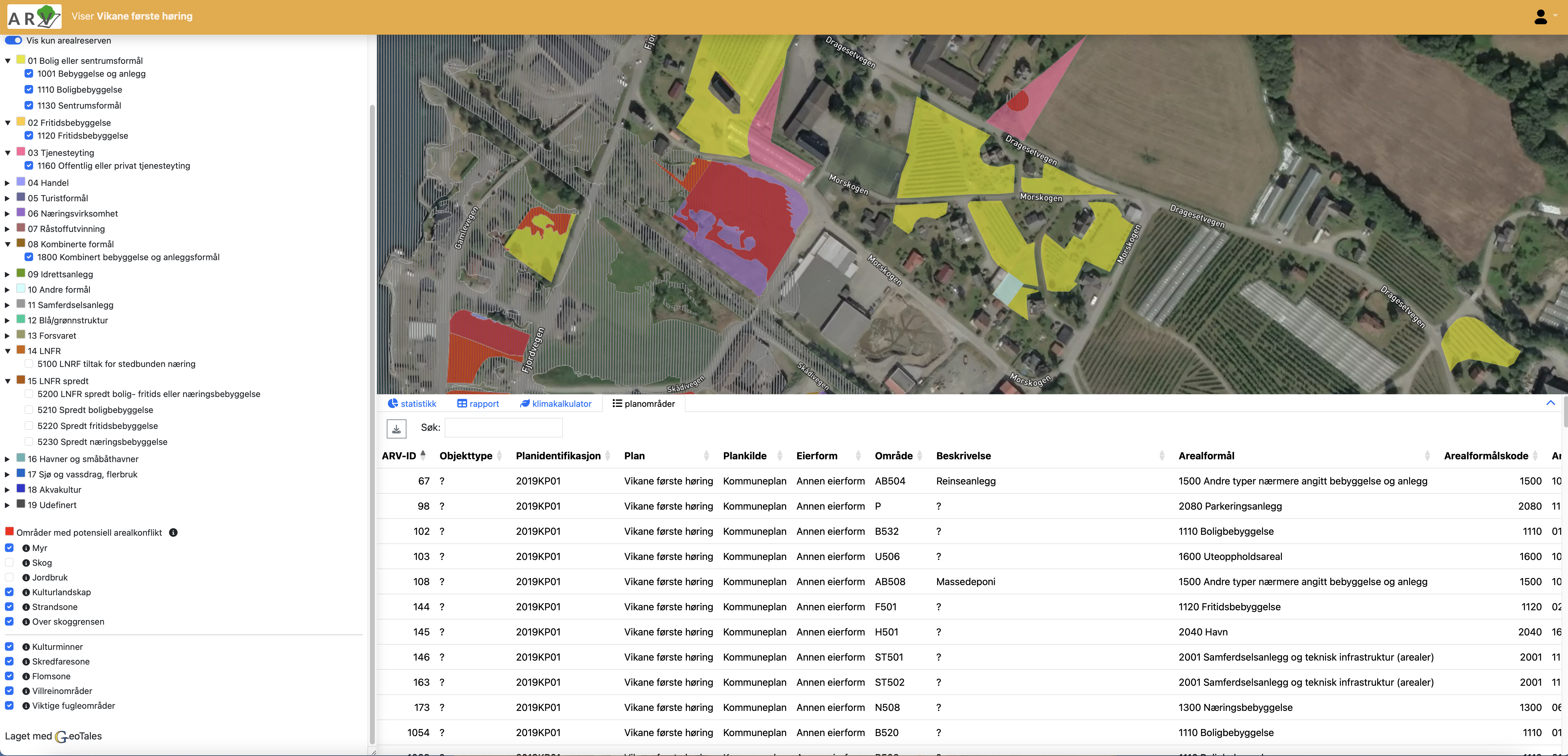 ARV er et operativt og fleksibelt verktøy utviklet spesielt for kommuner, private aktører og organisasjoner som ønsker raskere, bedre og mer bærekraftige beslutninger i arealplanleggingen. ARV analyserer seg frem til arealreserven (planlagt utbyggingsområde som ikke enda er utbygget) basert på dine plankart og utbyggingsdata fra kartverket. Dette grunnlaget analyseres opp mot en lang rekke datakilder for å identifisere potensielle arealkonflikter som ARV gir deg kart og tall for.